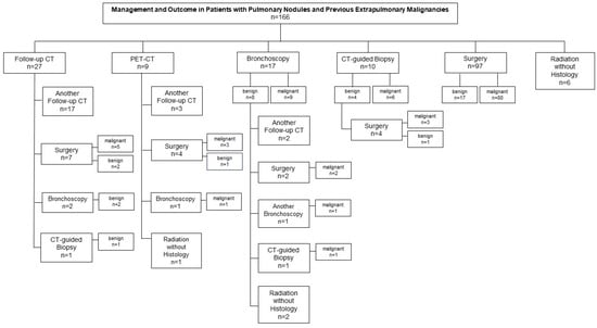 Figure 3. Management and outcome in patients with pulmonary nodules and previous extrapulmonary malignancies. Overall, a malignancy rate of 66.9% (111/166) was found. Out of 166 patients with a history of extrapulmonary cancer, 58.4% of patients (97/166) underwent immediate surgical resection that confirmed malignancy in 82.5% of the cases (80/97). Bronchoscopy was performed in 10.2% (17/166) of the patients revealing malignancy in 52.9% (9/17). In 47.1% (8/17) of patients with benign histology in the bronchoscopy biopsies, subsequent surgery (n = 2), another bronchoscopy (n = 1), and CT-guided biopsy (n = 1) confirmed malignancy. CT-guided biopsy was performed in 10 patients, in which malignancy was revealed in 60% (6/10), while in 40% (4/10), benign results were found. A subsequent surgery in these four patients resulted in three malignant diagnoses and confirmed one benign lesion. Follow-up CT or PET/CT scan was performed in 16.3% (27/166) and 5.4% (9/166) of the patients, respectively, followed by subsequent surgery in 30.6% (11/36), bronchoscopy in 8.3% (3/36), and CT-guided biopsy in 2.8% (1/36).