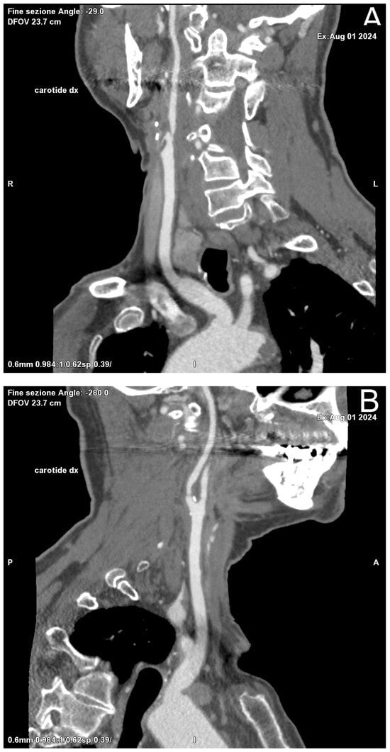 Among other diagnostic tests available for the evaluation of carotid stenosis, CT is often a second-choice test, performed as an adjunct to US. CT allows a more accurate and precise assessment of both plaque morphology and the degree of stenosis and, being relatively standardized across institutions and platforms, is not affected by operator influence. In addition, by providing a panoramic view of the entire vascular circle of the head and neck district, it allows us to analyze, in a single acquisition, both carotid arteries and the intracranial arterial circle, not accessible by ultrasound; moreover, it could be used for planning revascularization therapies thanks to reformatting software like MPR (Figure 2) and Volume Rendering (VR) (Carestream, ImageView Software, version 2.1, 150 Verona Street, Rochester, NY, USA).