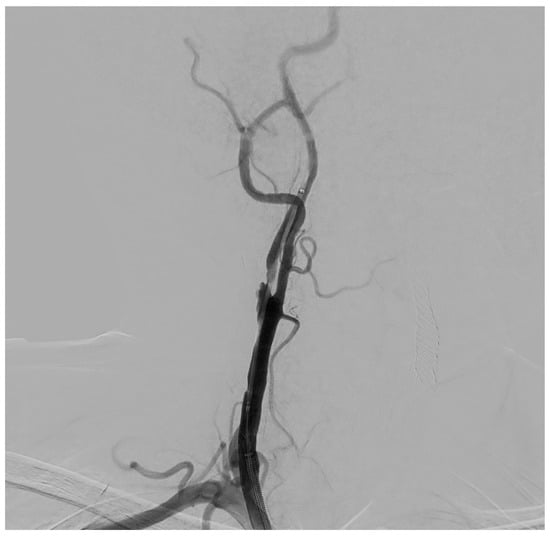 Final DSA control, in a patient with significant (>50%) stenosis of the ICA who has been treated by positioning a closed-cell stent (Boston Scientific Wallstent, 8 × 30 mm, 300 Boston Scientific Way Marlborough, MA 01752-1234) dilated with a balloon catheter (Ultraverse PTA dilatation catheter 6 × 20 mm, Becton, Dickinson and Company’s, 1 Becton Drive, Franklin Lakes, New Jersey 07417, USA).