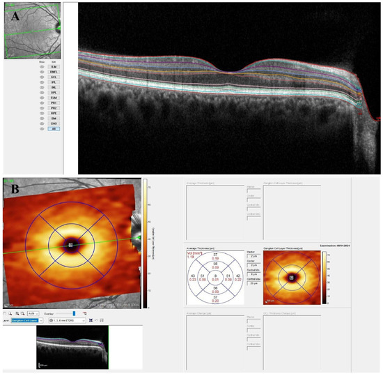 (A) An example of retinal layer segmentation in a healthy subject using Glaucoma Module Premium Edition (GMPE) software. (B) A retinal thickness analysis algorithm presenting mean thickness values (µm) for each of the nine regions defined by the Early-Treatment Diabetic Retinopathy Study (ETDRS) circle. Ganglion cell-layer measurements in a healthy subject are shown as an example.