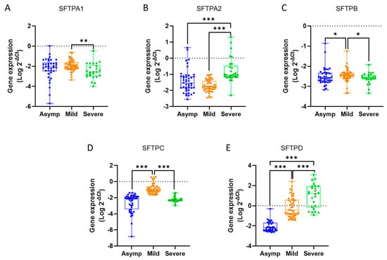 Relative gene expression levels of (A) SFTPA1, (B) SFTPA2, (C) SFTPB, (D) SFTPC, and (E) SFTPD across the three groups. Each dot represents the Log 2−ΔCt value, and the bar indicates the range from minimum to maximum. The Mann–Whitney U test was used for pairwise comparisons between groups. * p ≤ 0.05, ** p ≤ 0.01, *** p ≤ 0.001.