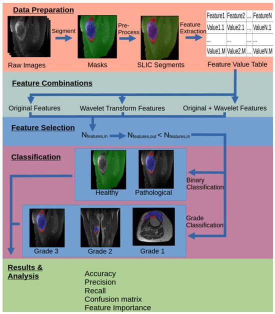 The workflow for this paper is outlined in Figure 1 and highlights the main steps. First, the raw magnetic resonance imaging (MRI) data are segmented into 3 masks—sarcoma, edema and healthy tissue—to produce masks. Then, simple linear iterative clustering (SLIC) segmentation is applied to the masks to generate super pixels (SPs). This is followed by radiomics feature extraction of each SP to generate a table of feature values, which are applied to raw image SPs and wavelet-transformed SPs. A feature selection step is applied separately for the different feature transform groups, and remaining features are finally used for the classification of healthy and pathological tissue (binary classification) and the severity or the grade of the sarcoma (grade classification) by applying a random forest (RF) model. Relevant metrics such as accuracy, precision, recall and confusion matrices are calculated, along with feature importance, to assess and analyze the results.