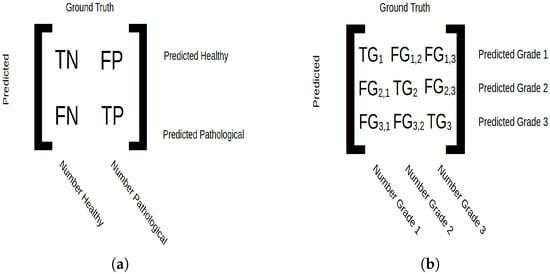 Confusion matrix setup. (a) For binary classification, true negative (TN) indicates tissue correctly predicted as healthy, true positive (TP) indicates tissue correctly predicted as pathological, false negative (FN) indicates pathological tissue predicted as healthy and false positive (FP) indicates pathological tissue predicted as healthy. The micro average displays the number of samples classified in integers, and macro average displays classification in ratios. (b) For grade classification, true grade () is the number of samples belonging to class i and predicted as such, and false grade () corresponds to samples predicted as grade i but belonging to grade j. The micro average shows the total number of classified data points, and the macro average shows number of classified patients.
