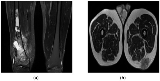 MRI slices: (a) A case of OS where the machine uses specific settings and contrast media to brighten the tumor region and suppress fat response. (b) Another patient (with liposarcoma in this case) where the tumor region is dark in contrast and fat tissue is not suppressed.