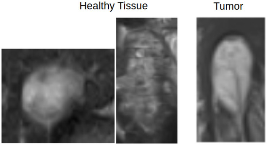 An example of how healthy and pathological tissue can overlap in terms of appearance. The left two images show healthy tissue, and the rightmost image shows a tumor region.