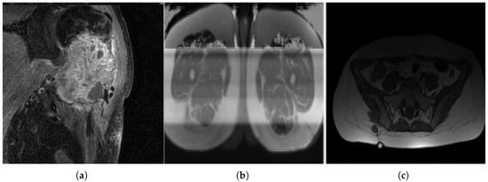 The dataset is complex, as sarcomas are diverse, making generalization difficult [8]. Variations in MRI scan protocols, such as differing contrast, fat suppression and weighting methods, contribute to variability in tumor appearance (Figure 3). Considering multiple orientations—axial, coronal and sagittal—adds complexity that the model must handle. Additionally, differences in gray-value ranges and MRI specifications complicate standardization. Some sarcoma types, like OS, are under-represented, making grade classification challenging, as the model may misclassify OS as a lower grade. Including sarcoma subtype information could improve classification.