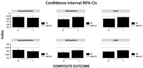 Predicted error margins of pulsation (PI) and resistance (RI) indices in uncomplicated and complicated twin pregnancies analyzed separately and in combination for chorionicity. 0—uncomplicated twins, 1—complicated twins.