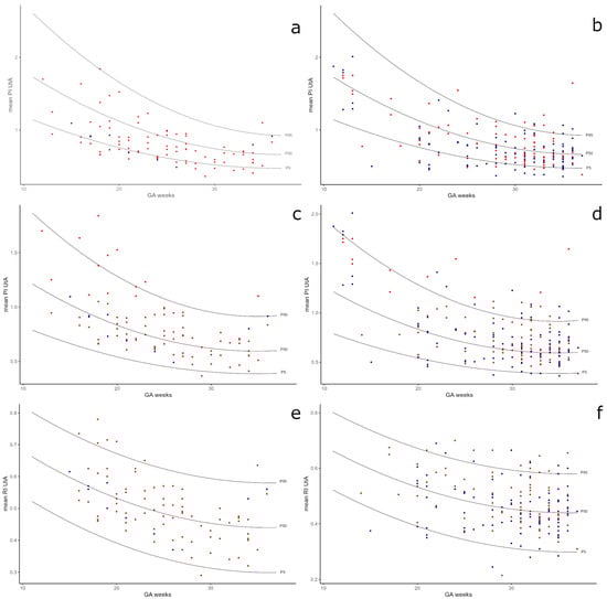 Comparison of study results to Gómez et al. singleton UtA PI nomograms (a,b), Geipel et al. DC twins UtA PI nomograms (c,d), and Geipel et al. DC twins UtA RI nomograms (e,f). Red dots—complicated twins, blue dots—uncomplicated twins.