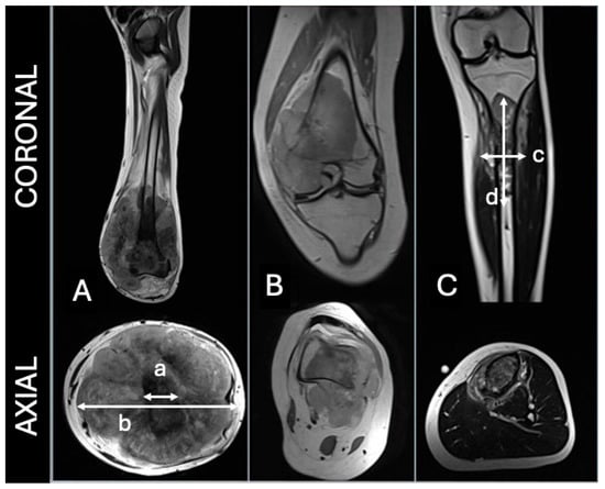 (A)—concentric, (B)—eccentric, (C)—longitudinal. For concentric, the tumoral width should be 1.5 greater than bone diameter (b/a > 1.5). For longitudinal, tumoral length should be 2 times greater than width (d/c > 2). Adapted from Kim et al. [8].