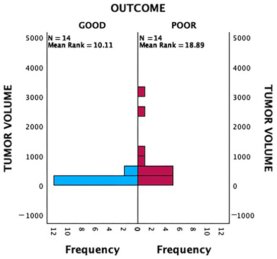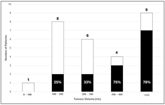 In total, 2 out of 8 patients (25%) with a tumour volume between 100 and 200 mls and 2 out of 6 patients (33%) with a tumour volume between 200 and 300 mls had poor 2-year prognostic outcome. For patients with a tumour volume between 300 and 400 mls, there was significant increase in the proportion of patients with poor 2-year prognosis with 75% (3 out of 4). This percentage does not increase further in patients with tumour volume more than 400 mls (Figure 6). Therefore, we categorised our data with 300 mls as a critical value for comparative analysis. Among patients with tumour volumes < 300 mls, 73.3% (11/15) had good outcomes, while 26.7% (4/15) had poor outcomes. Conversely, for patients with tumour volumes > 300 mls, only 23.1% (3/13) achieved good outcomes, whereas the majority (76.9%, 10/13) had poor outcomes. This association was found to be statistically significant (p = 0.008) (Table 3).