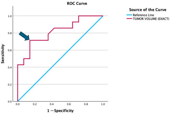 ROC curve illustrates the diagnostic performance of tumor volume in distinguishing between the good and poor prognosis groups. The red line represents the ROC curve for tumor volume, while the blue diagonal line is the reference line indicating no discrimination (AUC = 0.5). The arrow highlights the optimal cut-off point (322.5 mls), which corresponds to a sensitivity of 71.4% and specificity of 85.7% (1 − specificity = 0.143).