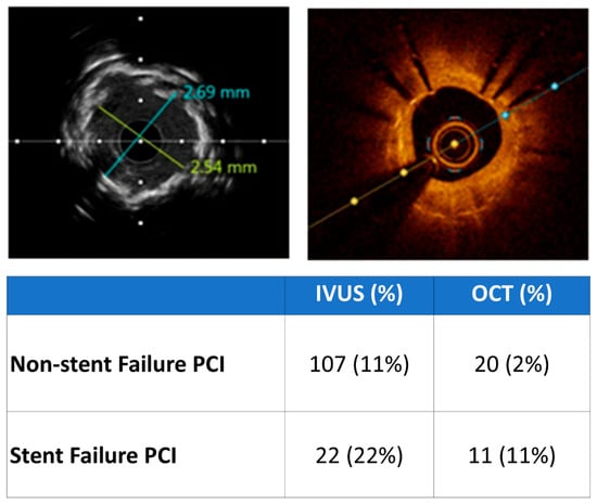 The application of modern stent platforms due to their material (the majority is made by cobaltium chromium or platinum chromium), thinner struts and biodegradable or more biocompatible durable polymer coating in combination with the use of potent antiplatelet agents in contemporary clinical practice have significantly reduced stent failure (SF) rates [1,2,3,4,5]. Nevertheless, there is still a low but not negligible rate of SF after the first year of percutaneous coronary intervention (PCI) that is estimated to be roughly around 2% per year [6]. In-stent restenosis (ISR) remains the most common reason for SF, with an estimated 5-year ISR rate of 9% to 12% for non-complex lesions [7,8]. Multiple risk factors for ISR have been recognized and can be separated into the following three broad categories: patient (i.e., diabetes mellitus, renal insufficiency and acute coronary syndrome [ACS]), angiographic (i.e., long lesions [>20 mm], small vessel diameter [<3 mm], bifurcation lesions and severe calcification) and procedural (stent underexpansion, fracture and bare metal stent [BMS]) factors [9]. Approximately 4–10% of PCIs are performed in the context of ISR, illustrating the burden of the disease that interventional cardiologists are called to address [10,11]. The pathophysiology of ST and ISR differs significantly from that of de novo lesions. The following two main mechanisms have been implicated in the pathogenesis of ISR: (1) biologic mechanisms that are expressed with (a) the development of neointimal hyperplasia concerning mostly previously implanted BMS and (b) neoatherosclerosis associated mostly with previously implanted DES, and (2) mechanical mechanisms represented mainly by stent underexpansion and, to a lesser extent, stent fracture [9]. Likewise, a variety of mechanisms have been identified regarding stent thrombosis (ST), such as stent malapposition, stent underexpansion, edge dissection, raptured neoatherosclerotic lesion, uncovered struts and coronary evaginations [12,13,14].