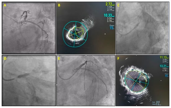 A 73-year-old woman presented complaining of exertional dyspnea. She had undergone left main percutaneous coronary intervention three years earlier. Coronary angiography showed an 80–90% focal stenosis in the ostium of the left anterior descending coronary artery inside the previously implanted stent (A). Intravascular ultrasound (IVUS) showed concentric calcification with underexpansion of the old stent (minimum stent area 2.7 mm2) (B). Inflations with a 4.0 mm non-compliant balloon failed to adequately expand the stent. Intravascular lithotripsy using a 4.0 mm balloon modified calcium and allowed subsequent symmetrical non-compliant balloon expansion (C). A 4.0 × 12 mm Megatron (Boston Scientific, Marlborough, MA, USA) drug-eluting stent was implanted (D). Final coronary angiography showed an excellent angiographic result (E), which was confirmed by IVUS imaging (minimum stent area, 9.1 mm2) (F).