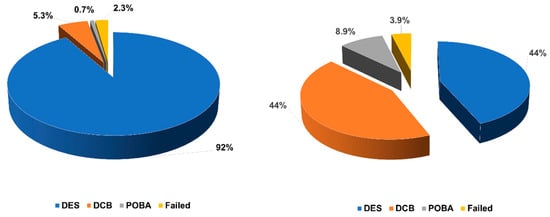- Giacoppo, D.; Alvarez-Covarrubias, H.A.; Koch, T.; Cassese, S.; Xhepa, E.; Kessler, T.; Wiebe, J.; Joner, M.; Hochholzer, W.; Laugwitz, K.L.; et al. Coronary artery restenosis treatment with plain balloon, drug-coated balloon, or drug-eluting stent: 10-year outcomes of the ISAR-DESIRE 3 trial. Eur. Heart J. 2023, 44, 1343–1357. [Google Scholar] [CrossRef]