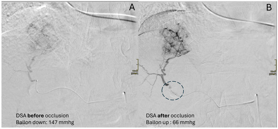 Clinical case of an 82-year-old female with HCC in HCV-related cirrhosis, treated with multiple locoregional treatments until 2022. In April 2024, an HCC nodule (sVII) up to 5 cm was newly diagnosed. The selective DSA performed with the deflated microballoon catheter (A) depicted the slightly hypervascular HCC, but not its microvasculature. The microballoon catheter’s inflation (dotted circle) due to flow redistribution improved HCC vascularization and the detection of its microvascularization, with a better subsequent diagnostic value of the DSA (B).