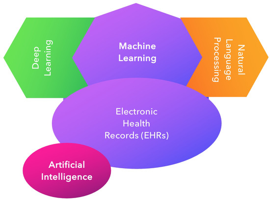 AI simulates, extends, and expands human intelligence. It covers tasks such as reasoning, learning, language processing, and the display of knowledge or information [32,34,35,36]. This is the era of big data: the digitalization of clinical data and the widespread use of electronic health records (EHRs) [37]. AI uses computerized algorithms to dissect these complicated data, encompassing various techniques, such as machine learning (ML), deep learning (DL), and natural language processing (NLP), showing some overlapping features [2,22,35,38,39,40,41]. These methodologies allow AI systems to analyze large volumes of medical data, identifying complex patterns [42,43,44] (Figure 1).