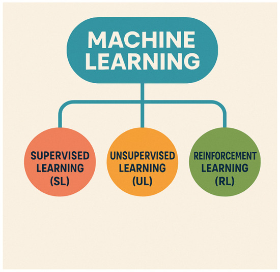 Table 1 explains the different subtypes of AI algorithms [30,45,46,47,48,49,50,51]. Useful information from unstructured data (clinical reports, operative notes, and discharge summaries) can be obtained by NLP technology. Narrative texts are transformed into data that computer programs can process [22,34,41]. ML tools construct analytical algorithms to iteratively analyze a huge amount of structured information, such as imaging and genetic data, and are able to extract meaningful patterns, creating prediction models about input variables [38,44,52,53]. ML is divided into three subtypes: Supervised Learning (SL), Unsupervised Learning (UL), and Reinforcement Learning (RL) [7,8] (Figure 2). SL is about training a model from input variables and their corresponding labels, using a dataset labeled by humans; SL can recognize different features independently, providing an output of the predictions in a large quantity of information [54]. Conversely, UL includes algorithms where the only inputs are raw features (outcomes are unknown), related to training a model to find patterns in an unlabeled dataset; UL can find hidden patterns in the data without human input [38,44,52].