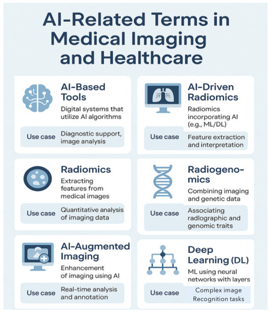 AI potentiates the interpretation of lung ultrasound (LUS), chest X-rays (CXRs), computed tomography (CT), and magnetic resonance imaging (MRI) [14,20,52,71,72,73]. AI has shown impressive precision and sensitivity in the identification of imaging abnormalities, both for diagnosis and monitoring (tissue-based detection and characterization)—changes in the imaging pattern that are not easily amenable to human detection and subtle changes of indeterminate significance [2,17,18,20,31,52,58,71,72]. Table 3 and Figure 6 explain common AI medical terms in medical imaging [17,22,30].