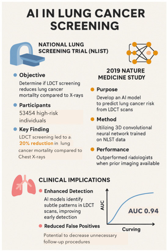 A 2019 study published in Nature Medicine used a DL model trained on National Lung Screening Trial (NLST) data to analyze LDCT scans for LC screening. The study showed improved detection and a reduction in false positives and helped radiologists with decision making [21,47,59,106,114]. The NLST and AI-CAD systems revealed that AI outperforms radiologists in lung nodule detection, with 94% accuracy for AI in detecting malignant lung nodules (Figure 8). Google’s AI system, trained on NLST data, automatically analyzes LDCT scans, increasing the detection rate of lung nodules by 5% while reducing false positives by 11%. AI algorithms like Google’s DeepMind and Qure.ai analyze LDCT scans with 95% accuracy [21,23,74]. By improving early detection, AI-powered LDCT screening improved early-stage LC detection rates by 50%, increased 5-year survival rates, and significantly reduced mortality and unnecessary biopsies (by 30%) [20,23,106].
