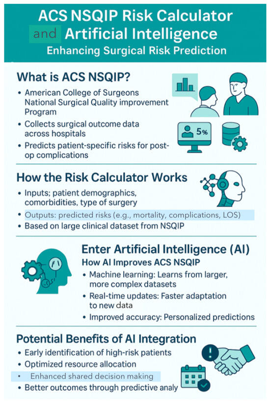 - Bilimoria, K.Y.; Liu, Y.; Paruch, J.L.; Zhou, L.; Kmiecik, T.E.; Ko, C.Y.; Cohen, M.E. Development and evaluation of the universal ACS NSQIP Surgical Risk Calculator: A decision aid and informed consent tool for patients and surgeons. J. Am. Coll. Surg. 2013, 217, 833–842. [Google Scholar] [CrossRef] [PubMed]