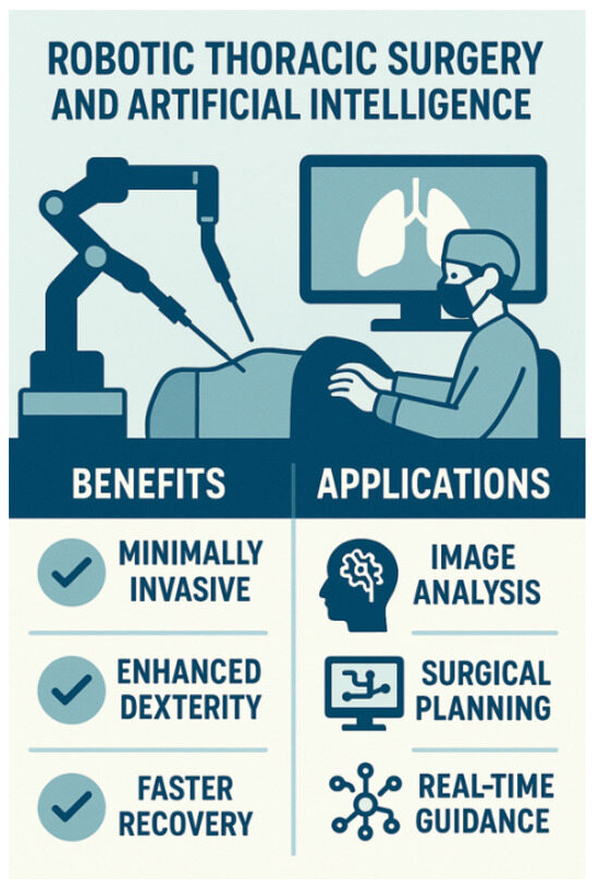 AI is expected to revolutionize the diagnosis of lung disease, the early detection of lung cancer (LC), surgical precision, and personalized treatment. Studies show an important role for AI in LC imaging analysis, optimizing the precision of screening and the efficiency of clinicians [2,20,21,22,23,24,25,26,27]. Patient outcomes can also be improved by optimizing thoracic surgeries, including video-assisted (VATS) and robotic-assisted (RATS) thoracic surgery [23,28,29].