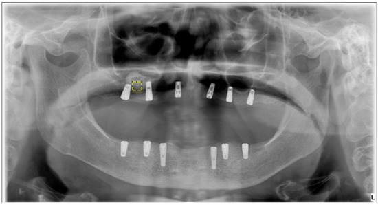 Figure 2 shows the selection of representative ROIs on a postoperative panoramic radiograph, highlighting standardized regions from both the grafted sinus floor and the native tuberosity site. The images were preprocessed following a standard protocol to isolate trabecular structures and enhance structural clarity prior to FD extraction. When necessary, the panoramic images were rotated to achieve optimal ROI alignment. The magnifying tool was used to enlarge the target area, and the defined ROI was cropped and duplicated for further processing. To reduce grayscale noise caused by soft tissue density and to enhance the visibility of trabecular patterns, a Gaussian blur filter (σ = 35 pixels) was applied to the duplicated image. The blurred version was then subtracted from the original, yielding a high-contrast image. A gray value of 128 was subsequently added to normalize intensity, followed by binarization to convert the image to black and white. As illustrated in