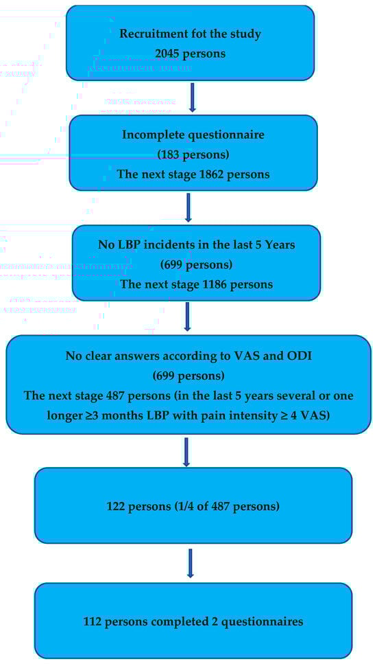 The study was conducted in the southern part of Poland (provinces: Silesia, Lesser Poland, and Opole). The inclusion criteria for the study were freedom of choice, age over 18 years, and no diseases or dysfunctions requiring treatment other than LBP. The exclusion criterion was the current occurrence of nsLBP requiring therapy.