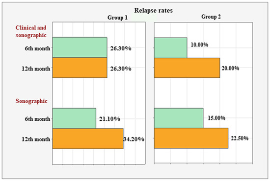 In Group 2, simultaneous clinical and sonographic relapse was observed in 10% (n = 4) of the patients at month six and in 20% (n = 8) at month twelve. The sonographic relapse rate increased from 15.00% (n = 6) to 22.50% (n = 9).