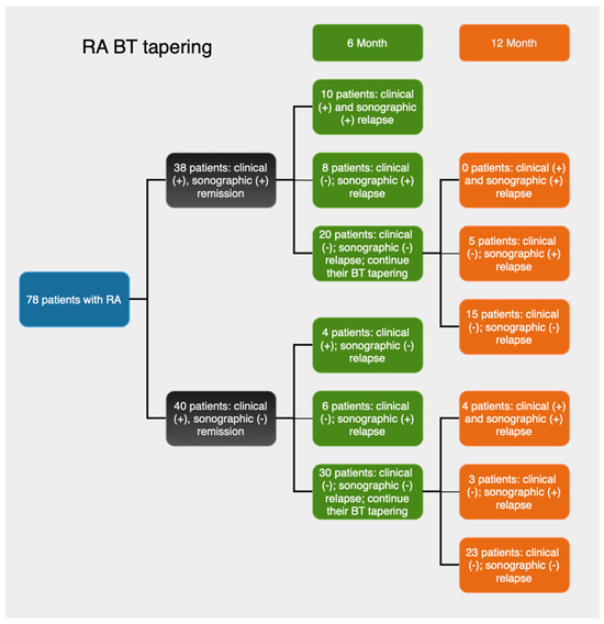 Variability in defining sonographic remission complicates clinical decision making. A standardized approach is necessary to translate sonographic findings consistently into clinical practice. Our study aimed to assess the role of US examination as a tool to identify RA patients in imaging remission, appropriate for BT tapering. Secondary goals were to find the rate of a sonographic and a clinical relapse at months 6 and 12 after BT tapering and to compare the rates of relapse in patients who tapered and those who continued standard drug therapy.