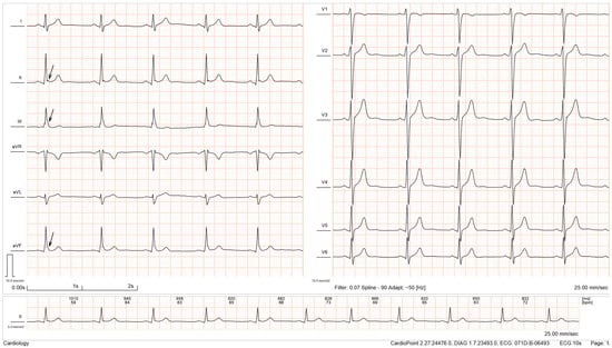 ECG recording with ERP in the inferior leads, showing prominent J waves (marked by arrows) (from the authors’ personal collection).