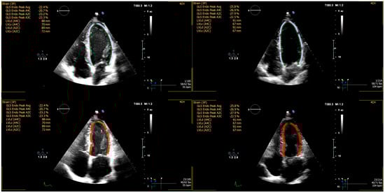 The left ventricular volumes (LVEDV—end-diastolic volume, LVESV—end-systolic volume), ejection fraction (EF), and stroke volume (SV) were calculated using the methods implemented in the QLab Cardiac Analysis software package, utilizing automated two-dimensional cardiac quantification (a2DQ). Additionally, strain measurements were performed, GLS (global longitudinal strain), using automated cardiac motion quantification (aCMQ) based on 2D speckle tracking analysis.