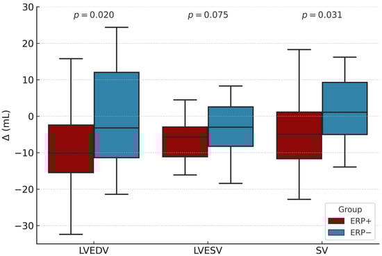 Boxplot showing exercise-induced changes in LVEDV, LVESV, and SV for ERP+ (dark red) and ERP− (blue) groups. The y-axis represents absolute changes (Δ) in milliliters. Boxes indicate the interquartile range (IQR), with the median marked by a horizontal line.