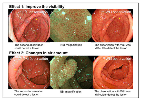 Case 1: A 2 mm non-polypoid polyp located in the cecum. (a) The lesion was detected during the second observation using TXI, which enhanced polyp visibility (yellow arrow). (b) NBI magnification findings were consistent with a typical adenoma. (c) A movie of the first observation was checked. The lesion was difficult to detect during the first WLI observation (yellow arrow). Case 2: A 10 mm polypoid polyp located in the ascending colon. (d) The lesion was detected during the second observation, adjusting the amount of insufflated air enabled visualization of a polyp hidden behind a mucosal fold (yellow arrow). (e) NBI magnification findings were consistent with a typical adenoma. (f) A movie of the first observation was checked. The lesion was difficult to detect during the first observation (yellow arrow).