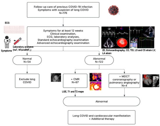 The inclusion criteria were the persistence of symptoms such as effort intolerance and/or fatigue and shortness of breath not explained by any other illness, age > 18 years, signed informed consent stating their willingness to participate, and previous positive nasopharyngeal and oropharyngeal PCR test for COVID-19. The criteria for diagnosing long COVID were persisting symptoms such as effort intolerance and/or fatigue and shortness of breath for at least 12 weeks following an acute COVID-19 infection (Figure 1). We used additional diagnostic and imaging methods to identify cardiovascular manifestations of long COVID. The patients underwent clinical examination, laboratory analysis, and conventional and advanced imaging echocardiography. In a group of patients without symptoms of adequate duration and no pathological findings, long COVID was excluded. The cardiac magnetic resonance (CMR), coronary computed tomography angiography (CCTA), and pulmonary angiography (PA) were performed in accordance with local regulative rules for patients with suspicion of long COVID diagnosis (Figure 1). CMR was performed on patients who met the criteria related to the duration of symptoms, as well as abnormalities identified in their electrocardiograms (ECGs) and echocardiograms. The following conditions were contraindications for the CMR procedure: the presence of metallic fragments (such as bullets, shrapnel, or pellets), cerebral aneurysm clips, magnetic dental implants, tissue expanders, prosthetic limbs, hearing aids, body piercings, claustrophobia, and the patient’s failure to sign a consent form for the procedure.