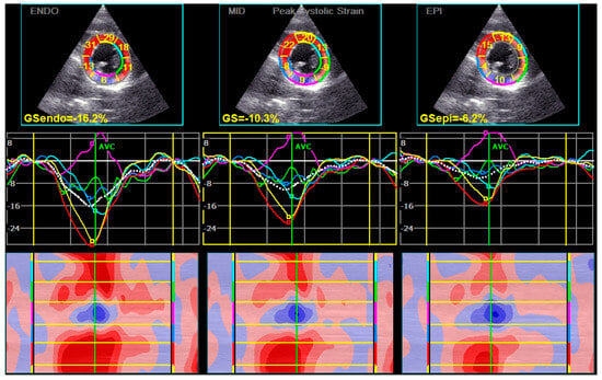 All patients underwent a comprehensive echocardiographic examination and advanced echocardiography using two-dimensional (2D) speckle-tracking echocardiography, which permits the assessment of myocardial deformation. The advanced echocardiography methods were utilized to better understand the mechanisms of cardiovascular disorders associated with long COVID. We analyzed longitudinal strain (LS), which represents the myocardial shortening in the long-axis plane, and circumferential strain (CS), which represents myocardial shortening in the short-axis plane, for all subjects. Moreover, LS and CS were calculated through the three myocardium layers. We defined the following three layers: sub-epicardium (epi), intra-myocardium (mid), and sub-endocardium (endo). Six myocardial walls and 18 segments in the longitudinal and short-axis views (three slices—base, mid, and apex) were analyzed. In end systole, a semi-automated function defined a region of interest (ROI) to assist in tracing the endocardial border. The investigator visually evaluated the ROI to ensure that the tracking of speckles and their widths was accurate, making manual adjustments when necessary. All findings were analyzed and measured offline in Echo Pac PC.