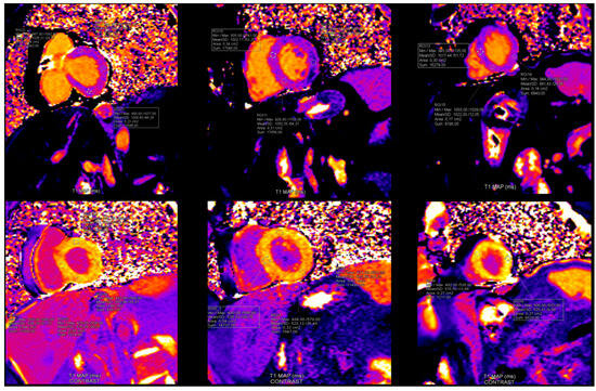 CMR with late gadolinium enhancement (LGE) can reveal myocardial injury and replacement fibrosis, which may be of ischemic or inflammatory origin. Elevated CMR T1 mapping may indicate diffuse fibrosis or infiltration, while elevated CMR T2 mapping may often indicate diffuse myocardial edema [36,41,42,43].