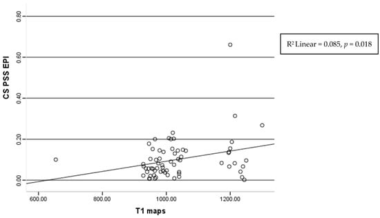 A significant correlation between the post-systolic shortening values in the epi circumferential layer and the native T1 mapping values was found (r = 0.212, p = 0.018) (Figure 6).