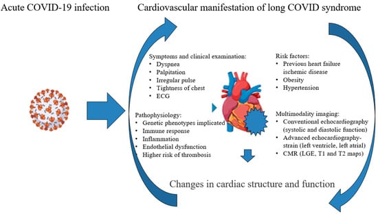 However, previous research has shown that the wide range of ongoing symptoms does not always align with cardiovascular dissociation or myocardial injury [7]. It is crucial to identify the specific pathophysiological mechanisms of the cardiovascular manifestation of long COVID using appropriate imaging techniques to gain a better understanding of the condition and develop effective treatment strategies. The impact of viral infection on the cardiovascular system can increase cardiovascular morbidity and mortality [13]. Valuable diagnostic methods such as laboratory analyses and clinical examination and multimodality imaging methods such as echocardiography, cardiac magnetic resonance (CMR), and computer tomography may be utilized to find cardiovascular manifestations in these conditions. However, some delayed complications remain not fully understood. The studies demonstrated subtle consistent reductions in left ventricle systolic and diastolic function as well as right ventricle functions using conventional and advanced 2D speckle-tracking echocardiography [14,15,16]. The findings highlight the need for cardiac assessments in long-term follow-up and the potential impact on clinical outcomes [17].