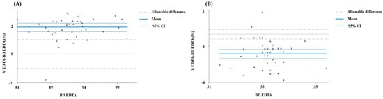 Difference plots comparing V-Tube K2EDTA and BD K2EDTA for: (A) MCV, (B) MCHC. The median values of MCV and MCHC showed 1.87% (1.55–2.13%) and −1.63%, −2.01–−1.26%.