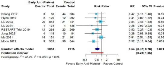 Our meta-analysis compared early antiplatelet therapy versus control across 8 studies, with a total of 4768 participants (2053 in the early antiplatelet group and 2715 in the control group). The random effects model demonstrated that early antiplatelet therapy was associated with a statistically significant 46% reduction in events compared to control (RR 0.54, 95% CI 0.37–0.78, p = 0.001). Heterogeneity among studies was low to moderate (I2 = 22.5%, τ2 = 0.0904, p = 0.25) (Figure 2).