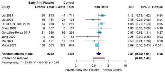 Mortality was evaluated across 8 studies comprising 4661 participants (2252 in the early antiplatelet group and 2409 in the control group). The pooled analysis yielded a risk ratio of 0.81 (95% CI 0.65–1.01, p = 0.06), showing no significant difference between the two groups compared. Moderate to substantial heterogeneity was observed (I2 = 53.4%, τ2 = 0.0419, p = 0.04) (Figure 3).