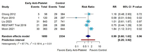 This meta-analysis evaluated early antiplatelet therapy versus control across 5 studies (Chong 2012, Flynn 2010, Liu 2023, RESTART Trial 2019, and Moon 2021) [10,13,21,22,25] comprising 3984 participants (1650 in the experimental group and 2334 in the control group). The random effects model yielded a risk ratio of 0.99 (95% CI 0.60–1.63, p = 0.96), indicating no statistically significant difference between early antiplatelet therapy and control. Substantial heterogeneity was observed (I2 = 67.7%, τ2 = 0.1814, p = 0.01), reflecting the inconsistent treatment effects across studies (Figure 4).