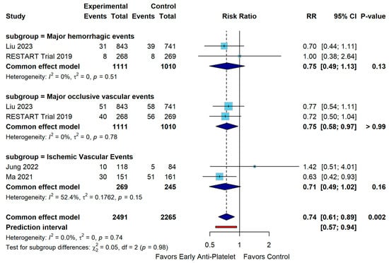Analysis of early antiplatelet therapy revealed no statistically significant reduction in major hemorrhagic events across two studies involving 2121 subjects (RR 0.75, 95% CI 0.49–1.13, p = 0.17). Examination of ischemic vascular outcomes in a smaller subset (514 participants, 2 studies) likewise showed a non-significant difference (RR 0.71, 95% CI 0.49–1.02, p = 0.60). However, early antiplatelet therapy demonstrated a statistically significant difference for major occlusive vascular events in the same population (RR 0.75, 95% CI 0.58–0.97, p = 0.03) (Figure 5).