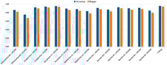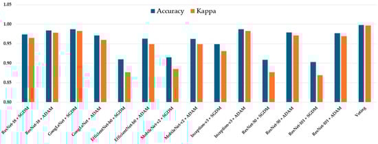 Each CNN model was compiled with a categorical cross-entropy loss function, appropriate for multiclass classification problems. Two optimizers—Stochastic Gradient Descent with Momentum (SGDM) and Adam—were used to train each network, allowing comparison of their influence on model performance. Evaluation metrics included accuracy, Kappa statistics, true positive rate, and precision.