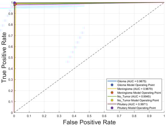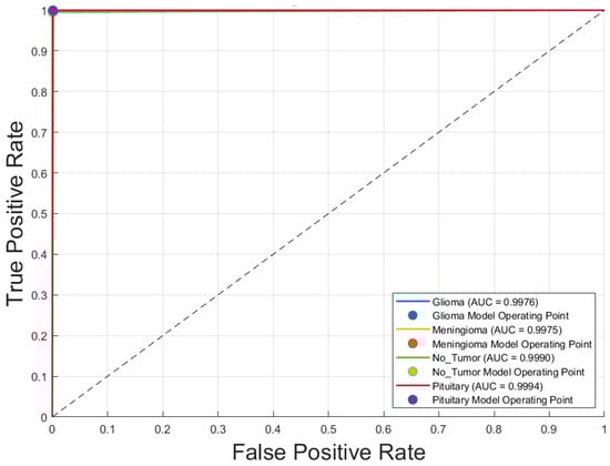 Figure 4 illustrates the receiver operating characteristic (ROC) curves for the four tumor classes—glioblastoma, meningioma, pituitary adenoma, and no tumor—classified by the optimal model, GoogLeNet with SGDM optimizer. The area under the curve (AUC) values for all classes exceeded 0.985, indicating excellent discriminatory ability. Specifically, the AUC values were 0.988 and 0.991 for both glioblastoma and meningioma, 0.991 for no tumor, and 0.996 for pituitary adenoma. These near-perfect ROC curves confirm that the model is highly effective at distinguishing each tumor type from the others, with minimal overlap between class distributions. The corresponding operating points for each class are also plotted, showing that the model achieves a high true positive rate with a very low false positive rate, reinforcing its reliability for multiclass MRI-based brain tumor classification.