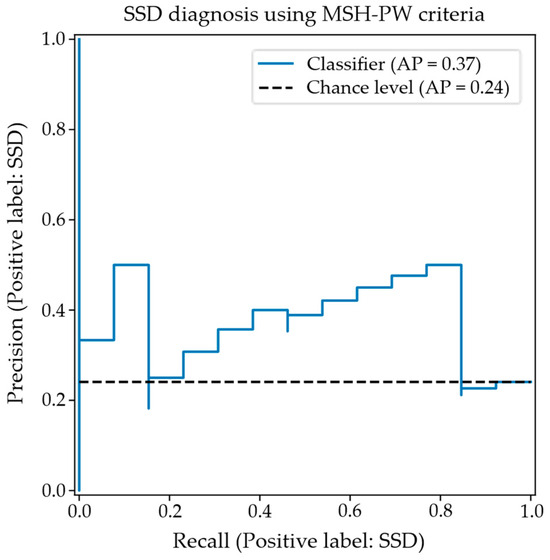 At an alpha of 0.01, a Monte Carlo simulation over one million runs estimated the significance threshold for the class balanced accuracy and precision statistics as approximately 0.729 and 0.661, respectively. Since the evaluated balanced accuracy and precision scores exceed these thresholds, it is concluded that the null hypothesis of no association between the mandibular perceptually scored MSH-PW criteria and the diagnostic class is rejected. The precision–recall plot of Figure 3 summarizes the classification performance for the SSD class, showing how precision/specificity varies with increasing recall/sensitivity. A typical precision–recall curve shows a relatively smooth tradeoff between recall and precision, with precision decreasing to chance levels as recall increases. The atypical profile of this plot likely indicates a lack of generalizability in the trained model.
