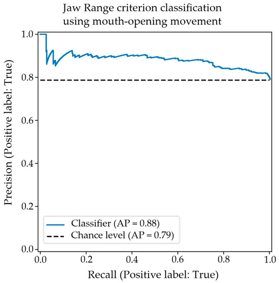The overall balanced accuracy was calculated as 0.67, and balanced precision was calculated as 0.62. Both these statistics are higher than the respective significance thresholds of 0.583 for accuracy and 0.542 for precision derived via the Monte Carlo simulation for their occurrence by chance at alpha = 0.01. It is, therefore, concluded that the null hypothesis of no correlation between the jaw range criterion and the objective mouth-opening facial feature is rejected. The associated precision–recall plot is illustrated in Figure 4, which shows that precision stays relatively high before smoothly decreasing past approx. 75% sensitivity.