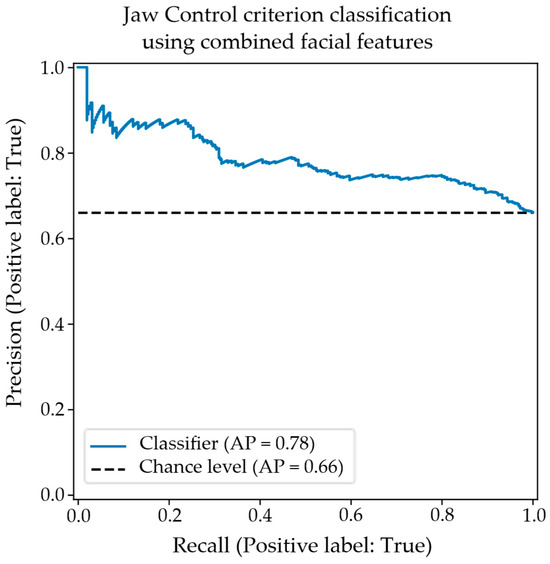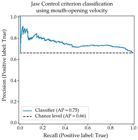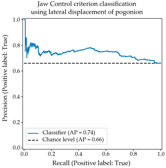 The confusion matrix showing results for the classification of jaw control using the objective measurement of the lateral displacement of the pogonion is shown in Table 7. Again, the results for balanced accuracy and precision are significant at alpha = 0.01; however, the relative incidence of type I and type II errors is reversed. This potentially indicates that the features are characterizing different aspects of the data. The associated precision–recall plot is shown in Figure 6. The classification performance tracks similarly to that obtained using the velocity of the mouth-opening feature.