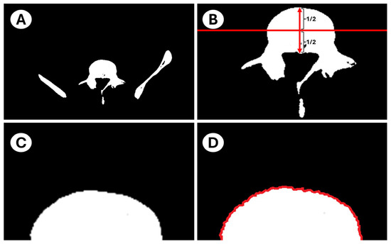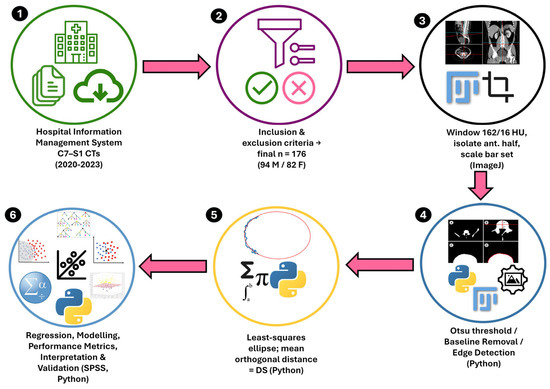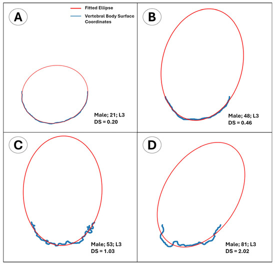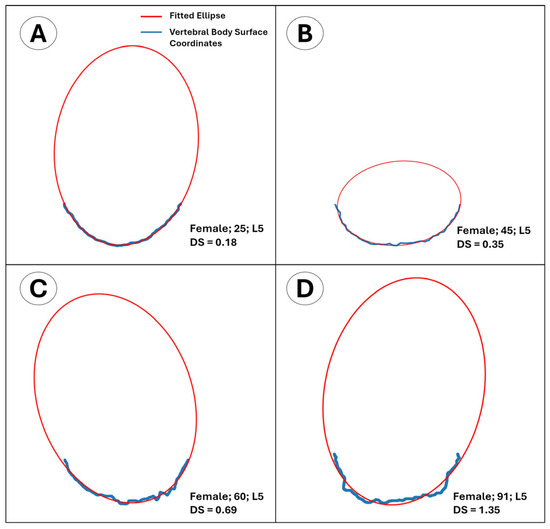 - The outline of the intact anterior half approximates an ellipse in young adults, providing a mathematically convenient reference shape. The posterior half was purposefully excluded to avoid pedicle interference and because its load path is dominated by trabecular rather than cortical bone. By fitting a least-squares ellipse to the intact anterior rim and computing the mean orthogonal distance of every boundary node to that ellipse, we obtain a single, observer-independent roughness index that quantifies cumulative cortical remodeling.