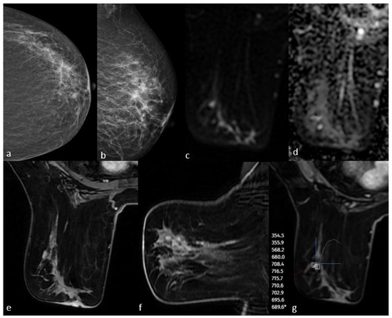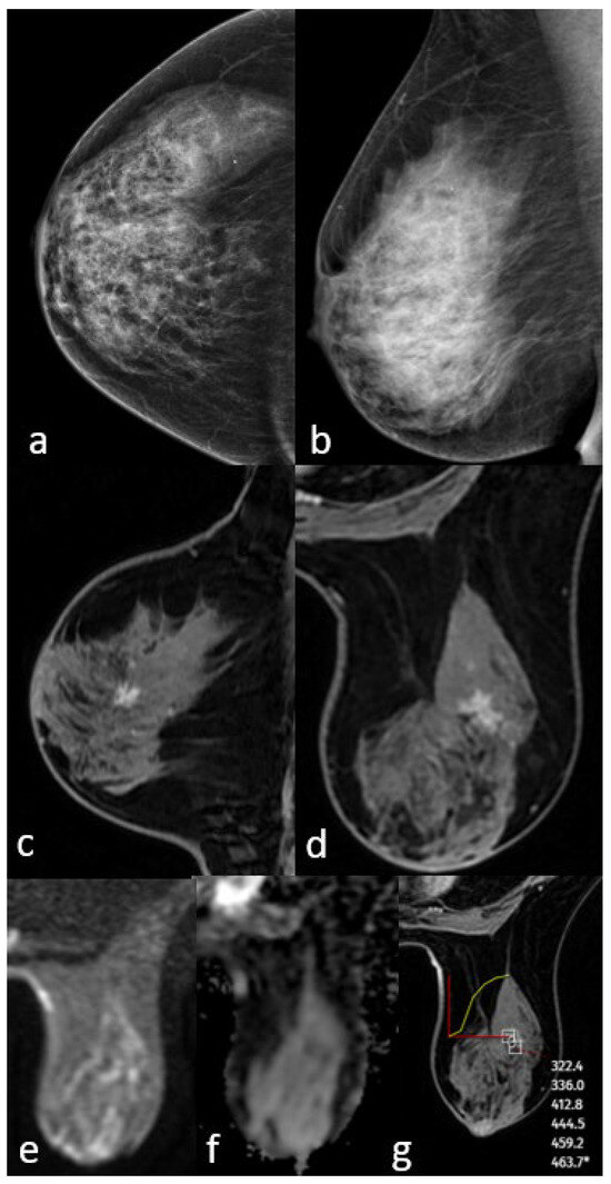 Mammography shows extremely dense breast density and no mass (a,b). MRI post-contrast T1-weighted images show an irregularly shaped mass with a spiculated contour (c,d). No significant diffusion restriction on diffusion-weighted imaging (e,f) and a persistent kinetic curve on the dynamic series (g). The pathology result is low-grade ductal carcinoma in situ.